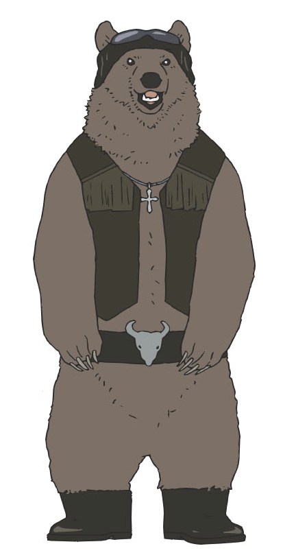 Grizzly is a tall, brown bear and is usually shown wearing a fringed black leather vest, a silver cross necklace, a pair of motorcyclist goggles, a thick belt with a silver bull buckle, and black leather boots. In early episodes, Grizzly wore a necklace with a gold coin but afterwards is seen with a silver cross necklace instead. Due to how strong he is, Polar Bear often calls him to ask for help with manual labor. The others tend to find him scary looking which is most likely due to him being a carnivore.