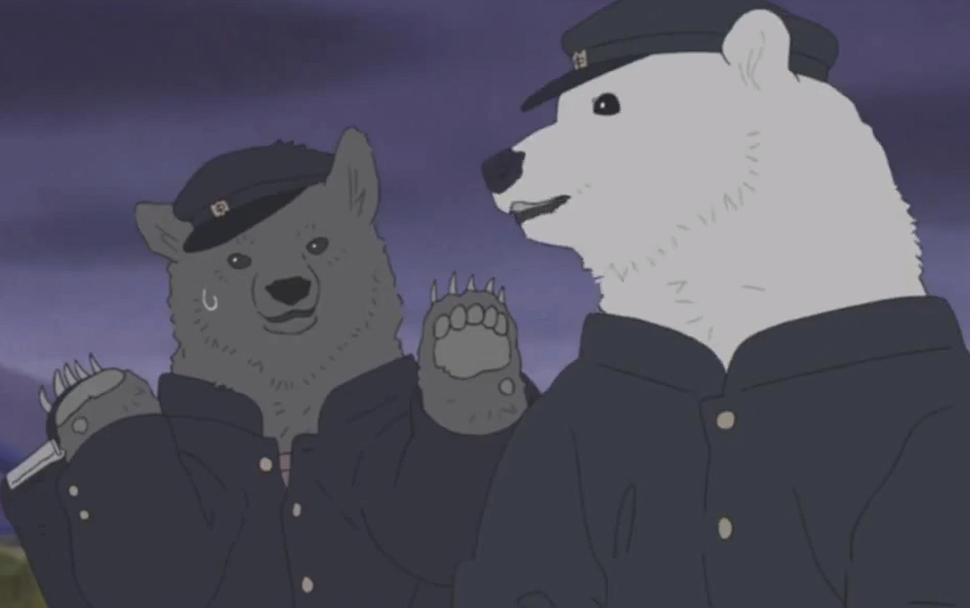Grizzly and Penguin are friends through Polar Bear. They once tried to make Polar Bear stop using puns in episode 43 by getting everyone to make the puns before Polar Bear could. They are both very similar characters in a sense due to their tsukkomi relationship with Polar Bear.